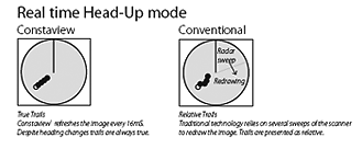 The second generation and patented Constaview is realised through the use of three high-speed processors (in-house Tornado technology). All info gathered by the radar is fully processed within a few milliseconds before displayed, generating a smooth image rotation when sailing in Head-Up mode. When changing to North-Up, the new radar image is displayed without any delay caused by the scanner rotation.